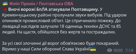 Пронін розповів, що цієї ночі у Кременчуцькому районі пролунали звуки вибухів. Під ударом опинився промисловий обʼєкт. Ворожа атака спричинила сильну пожежу.