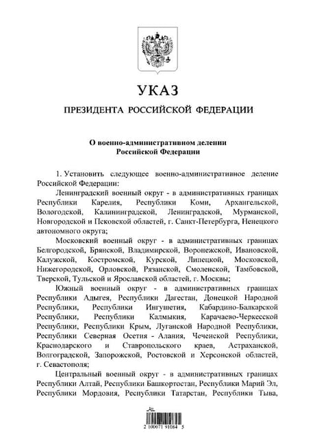 Про це йдеться в тексті указу російського президента "Про військово-адміністративний поділ РФ" від 26 лютого.