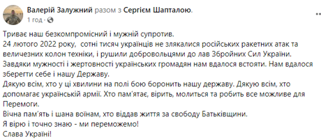 Своє звернення Залужний написав у Facebook.
